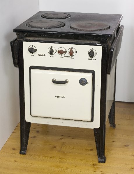 Elektroherd Fabrikat Küpersbusch, Backraumgröße: 33x23x47 (B,H,T) cm mit 3 Kochplatten und seitlichen, aufklappbaren Abstellflächen.