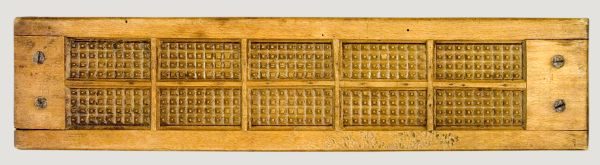 Rechteckiger Holzmodel für Kekse, unterteilt in zehn Felder mit pyramidalem Aufbau; auf Vorder- und Rückseite ist die Prägung: "D.R.G.M. No.171070" (Deutsches Reichsgebrauchsmuster) angebracht.