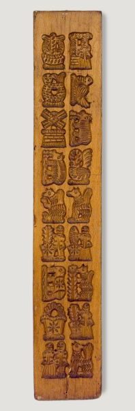 Model aus lackiertem, dunkelbraunem Holz zum Backen von Spekulatius (Gebäck aus Mürbeteig, in Deutschland ein typisches Weihnachtsgebäck); mit 18 verschiedenen Motiven: Blüten, Figuren, Tiere, Windmühle; paarweise angeordnet in neun vertikalen Reihen.