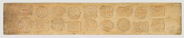Gebäckmodel aus Holz mit 18 verschiedenen Motiven (rund, eckig, blütenförmig); paarweise angeordnet in neun Reihen; mit dreieckiger Metallöse zur Aufhängung.