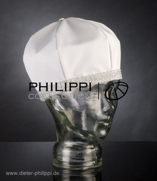 Ausführung mit sechs Kreissegmenten (Paneelen). Auf der Spitze befindet sich ein mit weißer Baumwolle überzogener Knopf (Durchmesser 2 cm). Der untere Rand ist mit einer 2,5 cm breiten Tresse aus silberfarbenem Metallgespinst verziert.