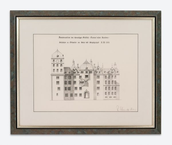 'Fassadenaufriss des ehem. Gräflich-Nassau'schen Residenz-Schloßes zu Ottweiler zur Seite des Schloßplatzes A.D. 1593'. Kopie einer Tusche-Zeichnung (Fassadenrekonstruktion) von Diplom-Ingenieur Ralf Schneider, Rottenburg, s/w, in Bilderrahmen. Als Sitz der Grafen von Saarbrücken bestand in Ottweiler bereits im Jahr 1186 eine Wasserburg; 1393 wurden erstmals 'Schloss, Burg und Vorburg' urkundlich erwähnt.