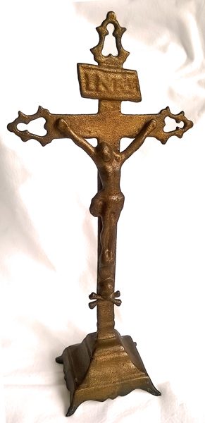 Das Kruzifix war wohl ursprünglich Teil einer Versehgarnitur. Das Kreuz mit Kreuzenden in durchbrochener Blütenform steht auf einem Postament, Christuskorpus, sowie die Tafel mit den Buchstaben INRI (Bedeutung: Jesus Nazarenus Rex Judaeorum steht symbolisch für die Tafel mit dem Todesurteil, die am Kreuz angebracht wurde) und ein Schädel mit Knochen (Memento mori: bedenke, dass Du sterben musst) sind aufgesetzt.