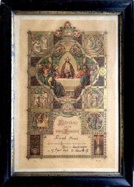 Schriftfeld teils handgeschrieben: Andenken /an die / erste hl. Kommunion / Kirsch Maria hat die erste hl. Kommunion empfangen in der / Kirche zu Marpingen / am 17. April 1898, Th. Schmitt Pf. (Pfarrer Theodor Schmitt geb. 13.9.1857 in Bitburg gest.12.4.1932 in Trier)