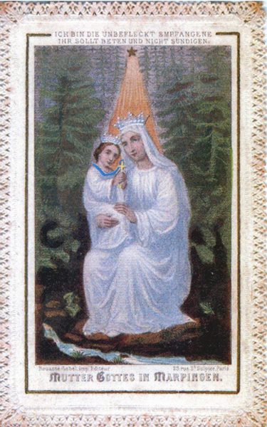 Kopie eines Andachtsbildes mit eingelegter Chromolithografie "Mutter Gottes in Marpingen" und Spitze imitierender Papierrahmung. Das Andachtsbild vermutlich aus dem Jahr 1876 trägt die Überschrift: Ich bin die unbefleckt Empfangene Ihr sollt beten und nicht sündigen. Es zeigt die Muttergottes mit weißem Gewand und weißer Krone mit Jesuskind auf dem Arm ebenfalls im weißen Gewand und weißer Krone. In der Hand hält das Jesuskind ein Kreuz, das mit blauem Band um den Hals gehängt ist. Im Vordergrund fließt ein Bach, über der Mutter Gottes mit Kind ist ein Stern aus dem Lichtstrahlen auf die Personen fallen. Im Hintergrund ist Wald dargestellt. Auf der Rückseite sind Fünf Gebete zu lesen, welche die Mutter Gottes zu einer achttägigen Andacht, dreimal des Tages zu beten empfohlen hat.