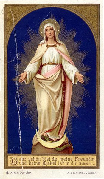 Mittig: Maria im Strahlenkranz vor blauem Grund, weiß bekleidet ?? Gewandinnenseite rosa und rot, auf Kugel stehend auf Schlange, davor Halbmond, (Mondsichelmadonna). GEBETBUCH Titel: Marianisches Liebesopfer, Untertitel: Vollständiges Gebetbuch für alle Verehrer Mariä besonders für den Verein der Marienkinder unter dem Schutze der unbefleckten Jungfrau, von einer Ordensperson, 9.Auflage, mit bischöflicher Approbation