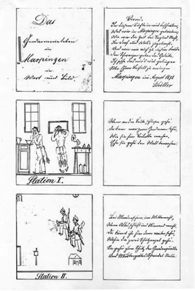Karikaturen "Das Gendarmenleben in Marpigen in Wort und Bild" 1876. Kopie der Karikaturen der diensthabenden Soldaten im Härtelwald Marpingen mit Übersetzung. Das Original ist ein Büchlein mit einzelnen Bildern und Texten. Es entstammt dem Nachlaß von Ernst Hentschel, geboren am 16.04.1831 in Stusa (Schlesien). Er war Gendarmerie-Oberwachtmeister in Wittlich von 1878 bis 1880. In den Jahren 1878 und 1879 war er abkommandiert nach Marpingen. Auszug aus dem Karikaturbüchlein