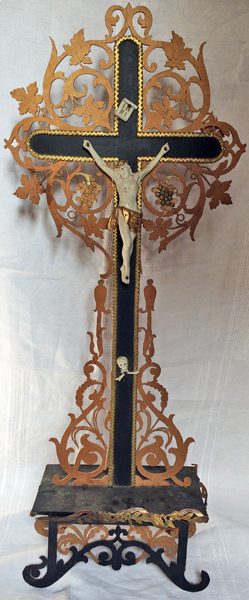 Florale Umrahmung von Kreuz und Postament in Laubsägetechnik , teilgefasst Ikonographie: Weinlaub, Weinreben, Ähren, Lilien