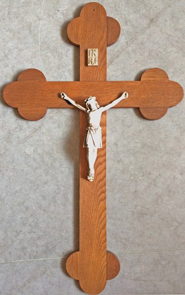 Kleeblattkreuz um1880 mit Applikationen Christuskorpus und INRI (Bedeutung: Jesus Nazareners Rex Judaeorum steht symbolisch für die Tafel mit dem Todesurteil, die am Kreuz angebracht wurde)