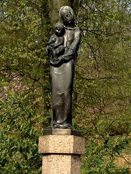 Die sechseckige Votivsäule mit breiterem Kopfteil trägt die Marienfigur mit Jesuskind