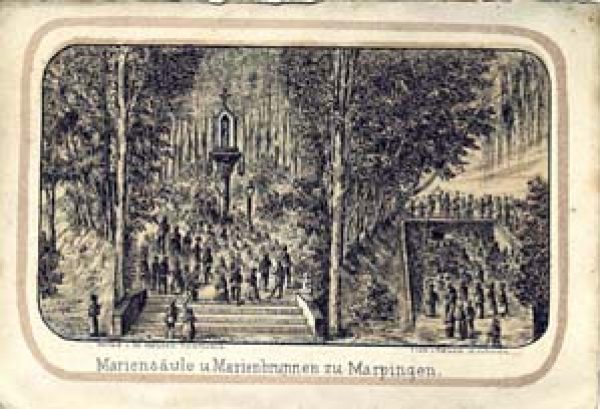 Lithographie aus dem Leporello (Faltbild bestehend aus sechs Lithografien von Marpingen siehe hierzu Inv. Nr. 2015SMK0002) Faltbild 5. Mariensäule und Marienbrunnen zu Marpingen