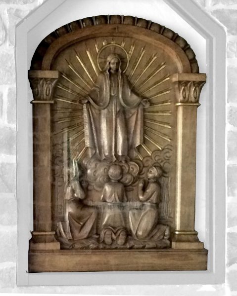 An der linken Wand in der Andachtsstätte an der Marienquelle ist die Holzschnitzarbeit des Marpinger Schreinermeisters Bohlinger aus den 1930-er Jahren, die drei Seherkinder von 1876 mit der Muttergotteserscheinung darstellend, zu sehen.