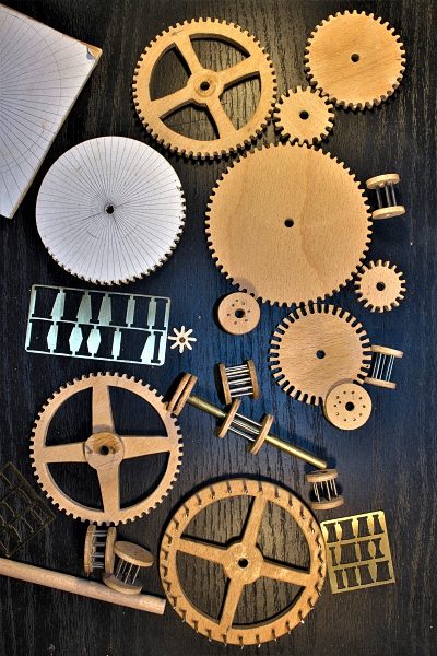 Das Bild zeigt eine Auswahl von Rädern und Trieben, die Herr Erhard Altmeyer für den Bau von Holzräderuhren angefertigt hat. (s. 2016SUM185 bis 189).