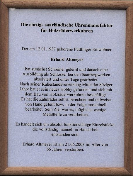 Der Text beschreibt wie Herr Altmeyer Mitte der 1980er Jahre mit Beginn seines Ruhestandes begann, Holzräderuhren zu bauen. Er berechnete die Zahnräder, feilte anfangs die Zahnräder von Hand, später mit Maschinen und bemühte sich möglichst wenig Metall zu verwenden.