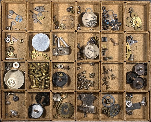 Die Ersatzteilschachtel enthält verschiedene Ersatzteile für Wecker: Sperrfedern, Klemmscheiben, Sperrkegel, Aufzugswellen für Armbanduhren, Unterlegscheiben, Räder für Taschenuhren, Pfeiler für Wecker, Anker für Wecker, Schrauben für Großuhren, Weckerabstellhebel und Wechselräder.