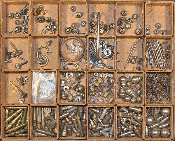 Die Ersatzteilschachtel enthält verschiedene Ersatzteile für Wecker, Armband- und Taschenuhren: Kronen für Taschenuhren, Aufzugswellen, Bügel, Zeiger, Weckerfüße, Absteller, Winkelhebel und Zeiger für Weckeinstellung.