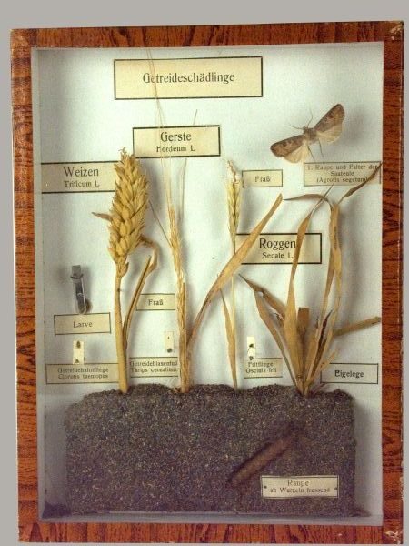 Schaukasten für den Biologieunterricht mit Papprahmen und Glasabdeckung, die Präparate mit der folgenden Beschriftung: Weizen, Gerste, Fraß, 1 Raupe und Falter der Saateule, Roggen, Larve, Fraß, Getreidehalmfliege, Getreideblasenfuß, Fritfliege, Eigelege, Raupe an Wurzeln fressend.
