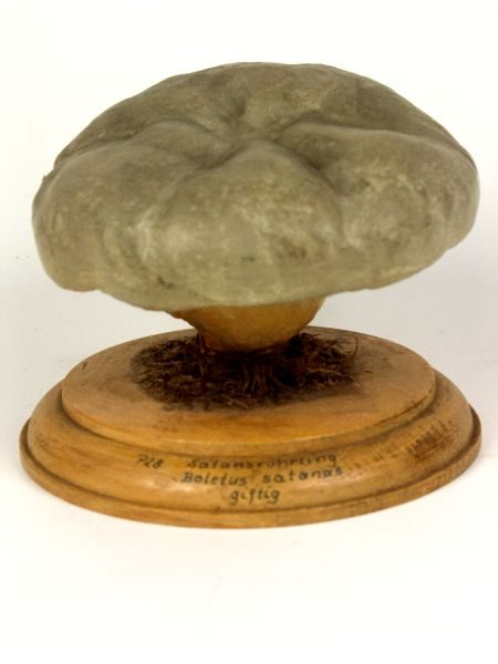 Pilz-Nachbildungen, Naturabgüsse, zusammengestellt zu ein bis vier Entwicklungsstadien, auf runden Holzsockel montiert.