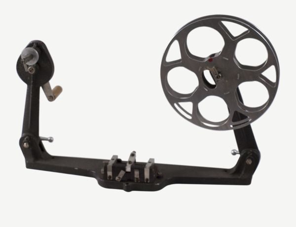 Älteres Filmumspul- und Schneidegerät ohne Herstellerangabe, das Schneidegerät sowie die beiden verstellbaren Spulenarmen, einer mit Handkurbel, sind auf einem massiven, braun lackierten Metallsockel befestigt, neben den Spulenarmen sind zwei Löcher für die weitere Befestigung, z.B. auf einem Tisch, vorgesehen. Verwendungszusammenhang in der Schule: Schüler-Film-AG oder filminteressierte Lehrer, die eigene Medien auf 16 mm-Film produzierten. Die Selbstreparatur und das Umspulen von geliehenem Bildstellenmaterial war unerwünscht.