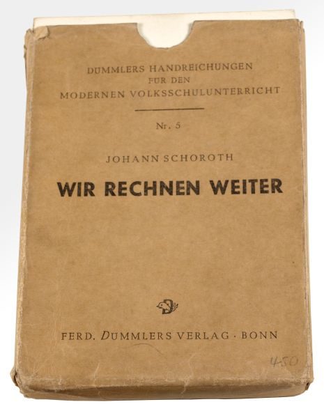 Rechenkarten für die Abschlussklasse der Volksschule, Nr. 5 aus der Serie "Dümmlers Handreichungen für den modernen Volksschulunterricht". "680 Rechen- und Raumlehreaufgaben mit Antworten und Beispielkarten", zusammengestellt von Johann Schoroth, Best.-Nr. 3605. Jedes Kärtchen enthält auf der Vorder- und Rückseite jeweils 5 Aufgaben, in brauner Pappverpackung, handschriftlich der Verkaufspreis "4,80" (DM).