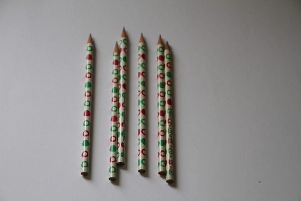 Sechs Milchgriffel der Fa. A.W. Faber-Castell 139 Hart, synthetische Minen in Holzfassung, bunt lackiert, auf Schiefertafeln weiß schreibend, mit einem feuchten Schwamm abwischbar. Durch die Holzfassung sind diese Griffel weniger zerbrechlich als normale Ganzschiefergriffel, sie können wie Bleistifte angespitzt werden.