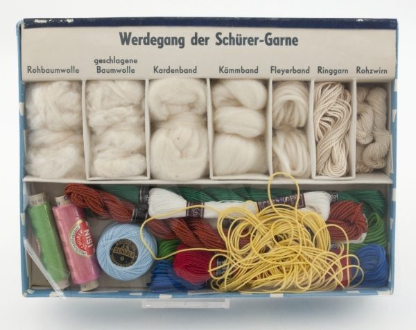 Kleiner Schaukasten für den Unterricht in textilem Werken, bestehend aus einer oberen Reihe mit sieben Abteilungen, darin die Exponate: Rohbaumwolle, geschlagene Baumwolle, Kardenband, Kämmband, Fleyerband, Ringgarn sowie Rohzwirn. In der unteren Reihe eine Sammlung verschiedener Schürer - Garne in Originalverpackungen. Textilfirmen boten Schulen oft didaktisches Anschauungsmaterial an, um damit auch auf ihre Produkte aufmerksam zu machen.