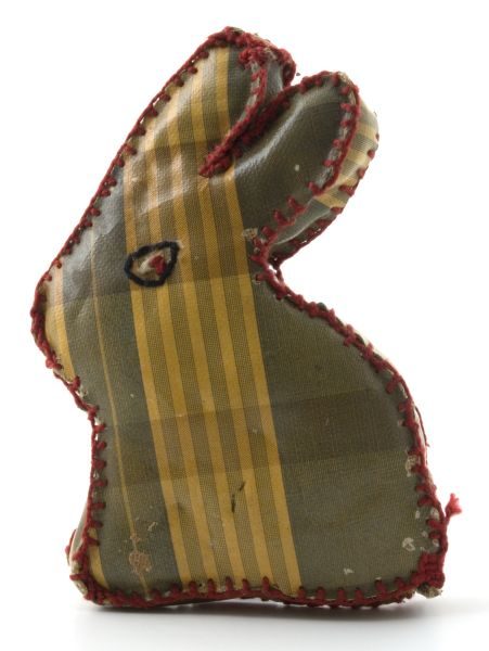 Kleines Stofftier in Form eines Hasen, vermutlich eine Schülerarbeit aus dem Handarbeitsunterricht, aus drei Teilen Wachstuch mit rotem Faden genäht.