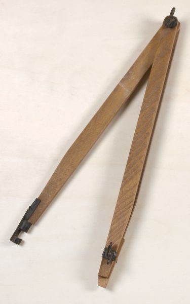 Kleiner zierlicher Zirkel für Schulwandtafeln, aus transparent lackiertem Holz mit Metallbeschlägen, am Ende des linken Schenkels ein Mechanismus zum Einklemmen von Kreide, am rechten eine verstellbare Holzspitze mit Befestigungsschraube, oben Flügel-Stellschraube aus Metall. Einfach gearbeitet. Keine Herstellerangaben.