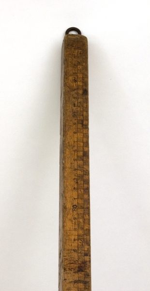 Vierkantlineal aus Holz, transparent lackiert, 1 Meter lang, mit Skalen auf drei Seiten, Millimeter, Zentimeter und Dezimeter. Metallöse zum Aufhängen am oberen Ende. Keine Herstellerkennzeichnung.