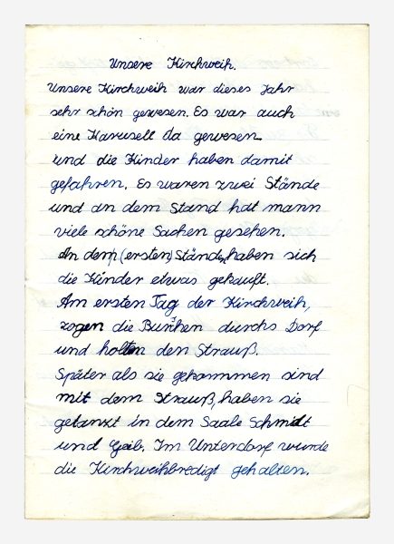 Der Nachlass umfasst Schulhefte im Format DIN A4 und DIN A5 sowie eine Loseblattsammlung mit Schülerarbeiten, Briefen, Quittungen etc. Die Hefte im Format DIN A5 im Einzelnen: 36 Hefte Deutsch (Aufsatz, Schönschreiben, Diktate etc.) datiert zwischen 1953 und 1955, 17 Rechenhefte datiert zwischen 1953 und 1958, 3 Heimat- bzw. Erdkundehefte, undatiert, 2 Geschichtshefte, eines datiert "7. Jahrgang 1956", 3 Zeichenhefte und 1 Heft Naturkunde, undatiert. Die Hefte im Format DIN A4 stammen von der Berufsschule Schönenberg, eines datiert "1958", im Einzelnen: 2 Rechenhefte, je 1 Heft Deutsch, Gemeinschaftskunde und Lebenskunde. Viele weitere Schulhefte unter 2007SSM1685 und 2007SSM1692.