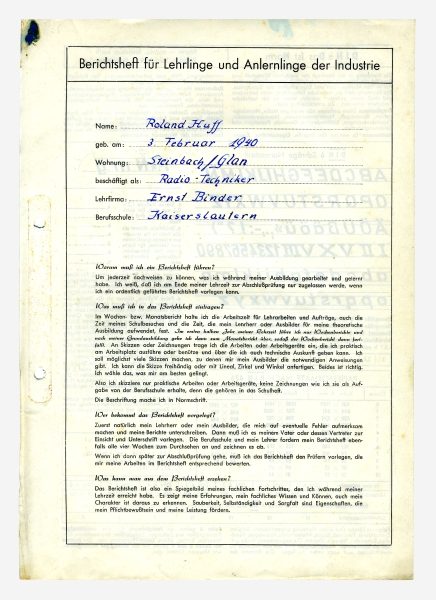 Der Nachlass besteht aus Heften im Format DIN A4 und DIN A5, im Einzelnen: DIN A5: 10 Rechenhefte, einige datiert: 7. Klasse 1952/53, 8 Deutschhefte, einige datiert: Klasse IIa 1954, 7 Erdkundehefte, 5 Aufgabenhefte, 2 Geschichtshefte, 3 Sprachlehrhefte, 2 Hefte "Schrift", 2 Hefte Englisch, 2 Hefte Stenografie, 1 Heft Naturkunde. Im DIN-A4-Format: 1 "Berichtsheft für Lehrlinge und Anlernlinge der Industrie", Fach Radio-Technik, Eintragungen von 1955 bis 1958, 1 Übungsheft "Das Formblatt im Schreibwerk des Handwerkers", wenige Eintragungen datiert 1957, 1 Heft betitelt "2 LAR 3" ohne Datum. Letzlich 3 Briefumschläge mit Inhalt, es handelt sich wohl um Übungsbriefe aus dem Schulunterricht, datiert 1954.