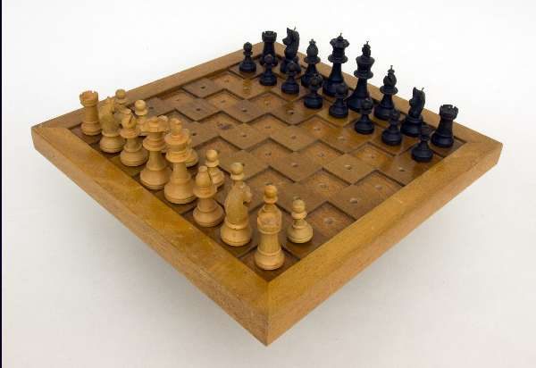 Schachbrett für Blinde, die weißen und schwarzen Felder sind erhöht bzw. vertieft, in den Feldern mittig jeweils ein Bohrloch, die Figuren haben einen Steckfuß, die schwarzen Figuren zusätzlich einen Metallnagel an der Spitze. Keine Herstellerangaben.