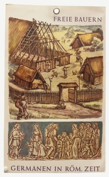 Einzelbild aus der Bildstreifenserie "Geschichte als Gegenwart" von Siegfried Hasler (Autor) und Hermann Maillinger (Zeichnungen). Jedes Einzelblatt mit Beschriftung und mit metallgefasster Aufhängeöse. Die Blätter dienen der Veranschaulichung im Sinne visualisierter Geschichte und wurden ursprünglich von einem erklärenden Textheft begleitet. Hier aus der Serie Nr. 7: "Germanen in römischer Zeit" Bild 1: "Freie Bauern". Dargestellt ist ein germanisches Gehöft, gebaut aus Holz und Stroh bzw. Schilf, unten eine Großfamilie.
