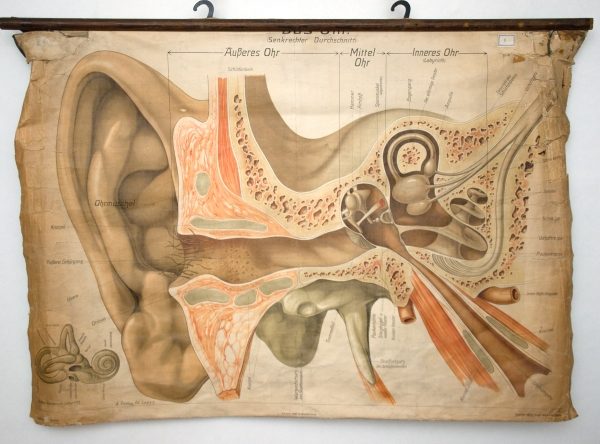 Schulwandbild für den Unterricht in Biologie: Eine anatomische Wandtafel, die in farbigen Abbildungen den Aufbau des menschlichen Ohres zeigt; mit leinenverstärkter Rückseite, Holzleiste und zwei Haken am oberen Rand zur Aufhängung; Beschriftung in der linken unteren Ecke: "Zschommlers Ohrtafel", rechts: "Copyright 1920 by Rudolf Schick und Co., Leipzig".