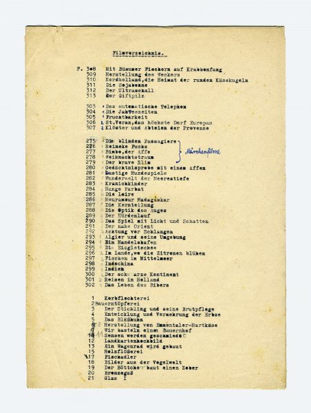 Filmverzeichnis bestehend aus 5 Einzelblättern, vermutlich per Wachsmatrize vervielfältigt, die Filme sind gruppiert, ohne dass die Gruppen näher bezeichnet wären, innerhalb der Gruppen laufende Nummerierung. Keine Datums- und Herstellerangaben, vermutlich aus den 1950er Jahren.