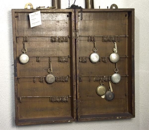 Der Beobachtungskasten für Taschenuhren hat zwei Flügel und wird geöffnet an die Wand gehängt oder kann zusammengeklappt wie ein Koffer transportiert werden. In vier Reihen können Taschenuhren an Haken aufgehängt werden und der Gang kann beobachtet werden.