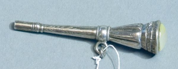 Silberner Trompeten-Taschenuhrschlüssel mit einem gelben Halbedelstein am Kopfende.