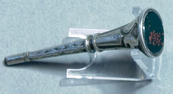 Silberner Trompeten-Taschenuhrschlüssel mit einem grünen Halbedelstein am Kopfende. Der Schaft ist verziert, in der Mtte ist eine Öse angelötet.