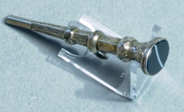 Silberner trompetenförmiger Taschenuhrschlüssel mit einem grünen Halbedelstein am Kopfende.