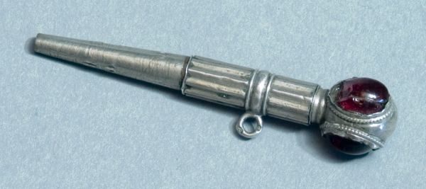 Knebelförmiger silberner Taschenuhrschlüssel mit drei gefassten Steinen am oberen Ende und einer Öse im mittleren Bereich.