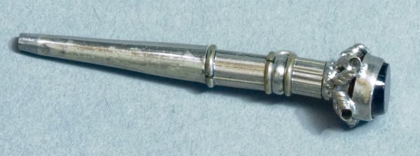 Knebelförmiger silberner Taschenuhrschlüssel mit gefasstem flachem Stein am oberen Ende.