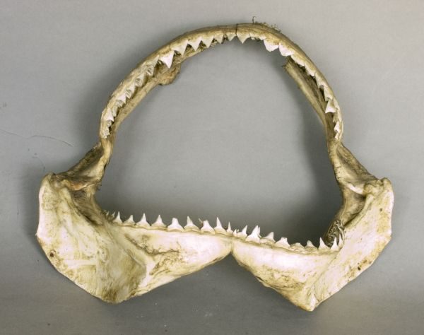 Haigebiss; Ober- und Unterkiefer mit Knochen und Hautresten; Gebiss ist aufgerissen ähnlich einem großen Fangeisen; mehrere hintereinander liegende Zahnreihen sind erkennbar.
